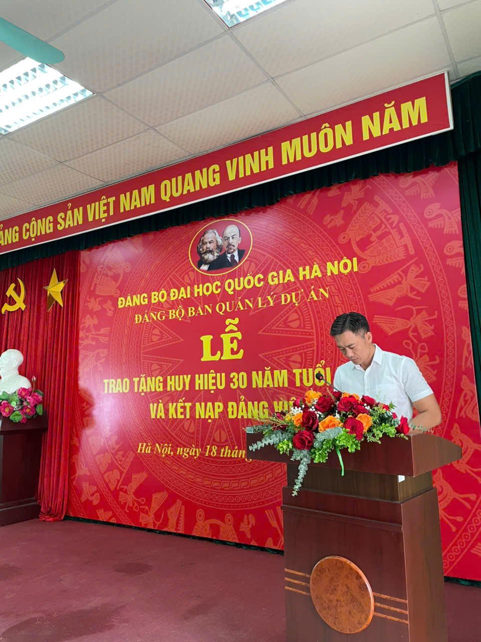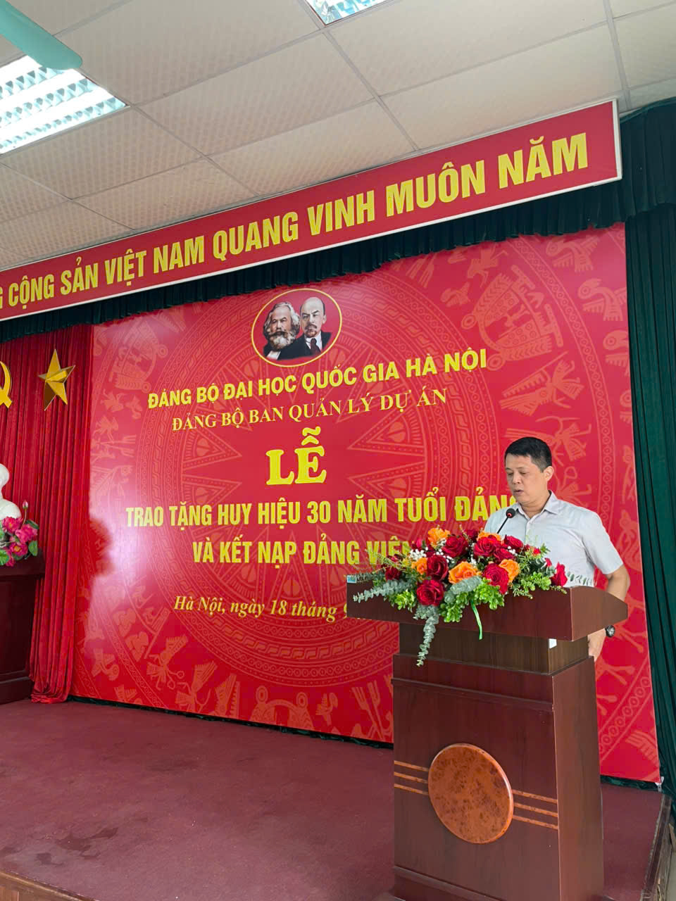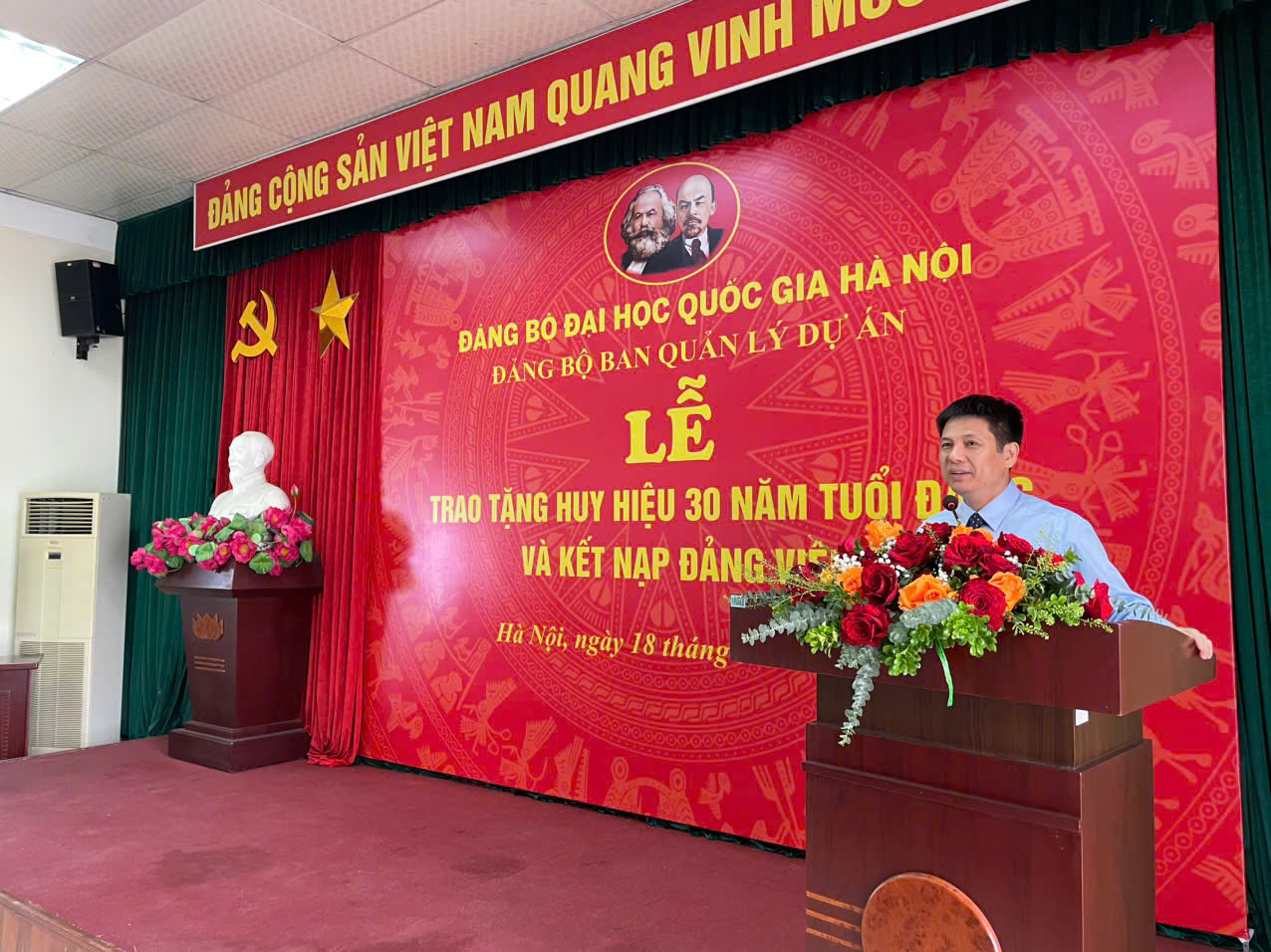 Tham dự buổi lễ có đồng chí Nguyễn Hiệu – Phó Bí thư Thường trực ĐHQGHN, Phó Giám đốc ĐHQGHN; đồng chí Nguyễn Minh Tuấn – Phó Bí thư Đảng ủy, Phó Giám đốc Ban QLDA; cùng các đồng chí trong Ban Chấp hành Đảng bộ, Bí thư, Phó Bí thư các chi bộ trực thuộc và toàn thể đảng viên trong Đảng bộ.