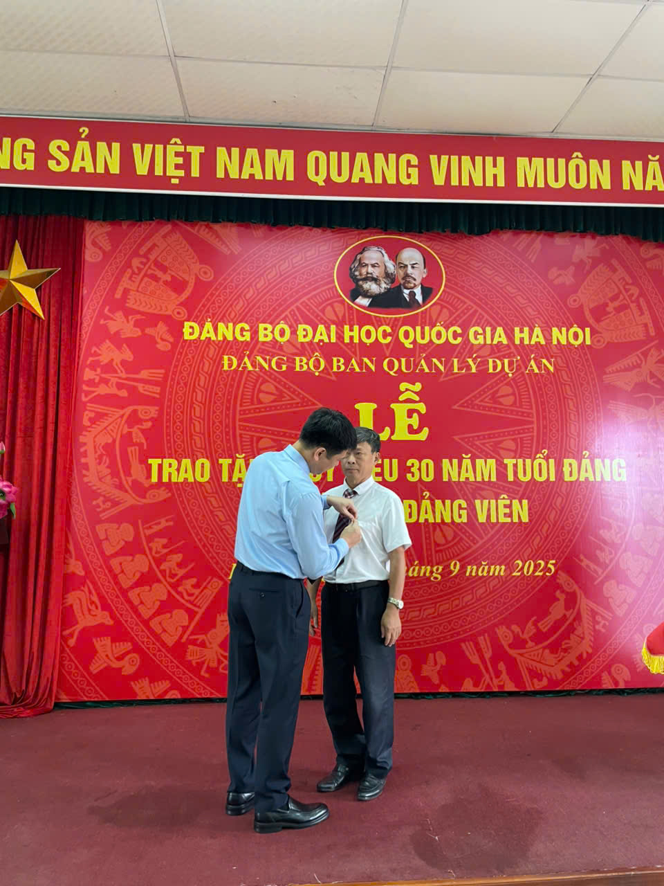 Đ/c Nguyễn Hiệu - Phó Bí thư thường trực ĐHQGHN, Phó GĐ ĐHQGHN trao Huy hiệu 30 năm tuổi Đảng có Đ/c Nguyễn Văn Chung